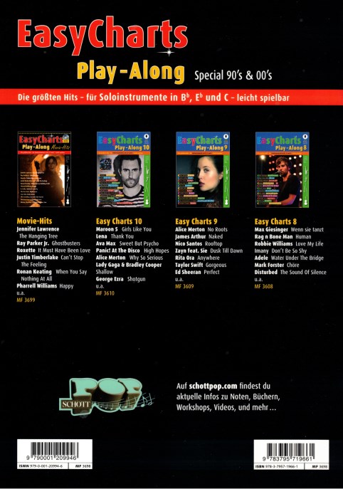 Was haben Shakira, Take That und die Scorpions gemeinsam? Richtig – sie sind alle im neuen Sonderband in der Reihe Easy Charts Play-Along enthalten! Die besten Popsongs der 1990er- und 2000er-Jahre bieten ein reichhaltiges Repertoire für Melodieinstrumente in B, C oder Es. Mit dabei sind ausschließlich Nummer 1-Hits von den bekanntesten Boygroups, Mariah Carey, Coldplay und natürlich Katy Perry. Die leicht spielbaren Bearbeitungen enthalten jeweils Play-Along-Tracks zum Anhören und Mitspielen.